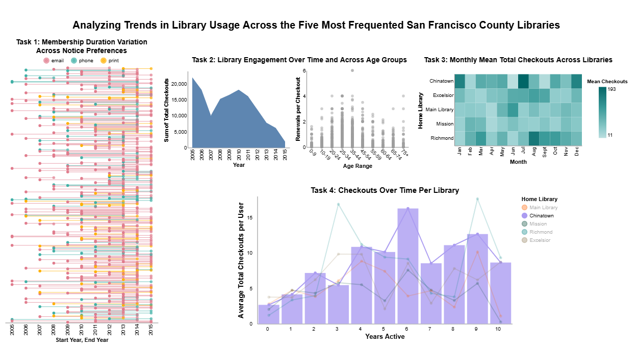 With the help of two group members, we created the following dashboard where we looked into trends for attendance at libraries in the San Francisco area. We had the requirement to create inventive visualizations to explain 4 questions. The dashboard is fully interactive and has toggle options (not shown in image below).
